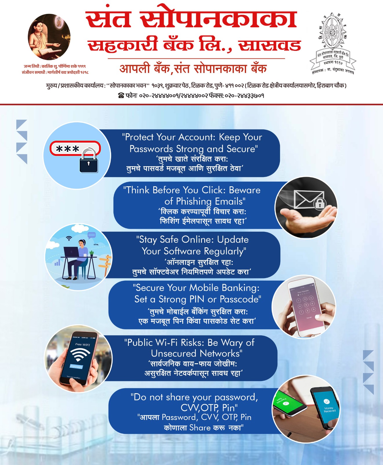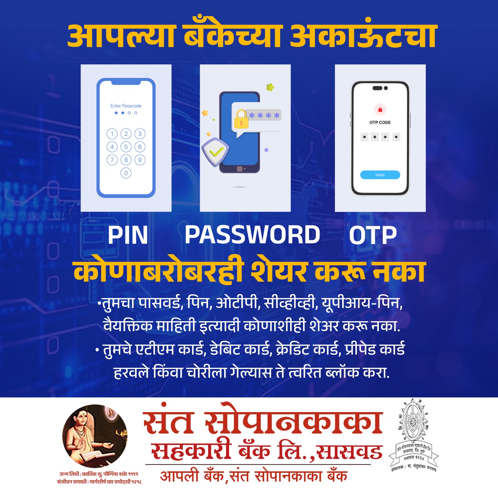 At Santsopankaka Sahakari Bank Ltd., the security of our customers’ financial information is our highest priority. We encourage all customers to follow safe banking practices while using mobile banking, ATMs, or any digital banking services.