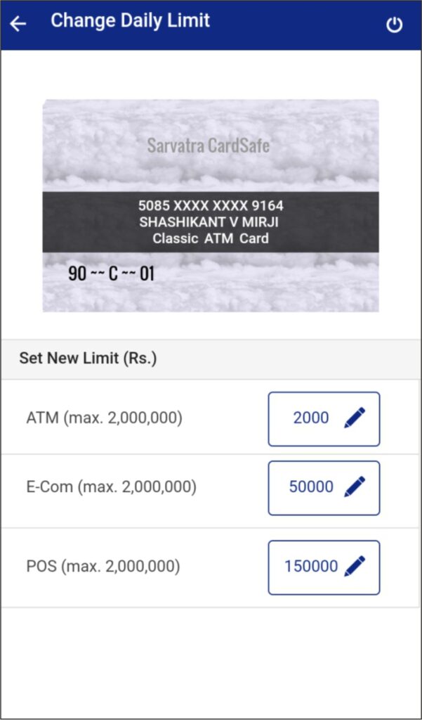 After clicking on set daily limit edit button, following window will appear. Card holder can change daily limit for ATM, POS and ECOM daily transaction limit. This limit can’t be more than bank limit.