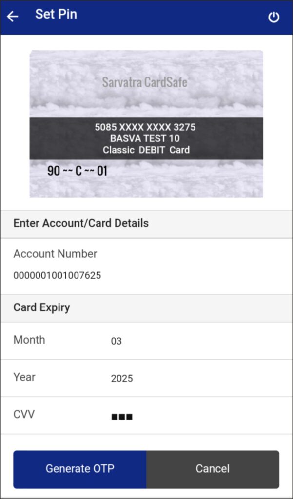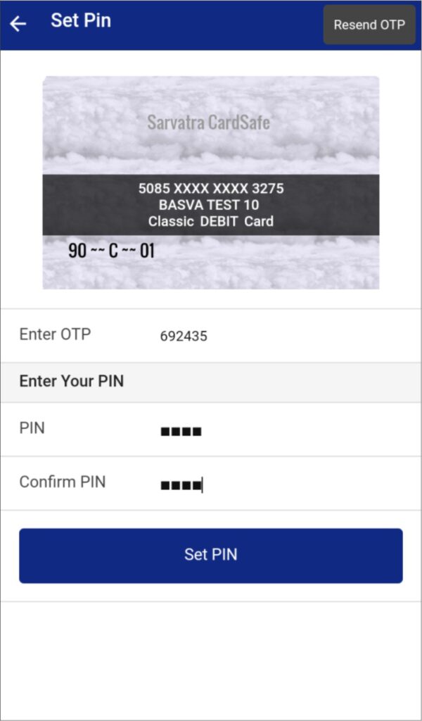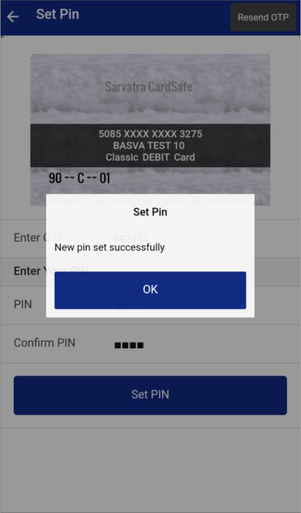 After clicking on Generate OTP, application will generate OTP and same will be send on register mobile number. Card holder needs to enter OTP, and ATM transaction PIN which want to set with confirmation PIN and click on Set PIN.
