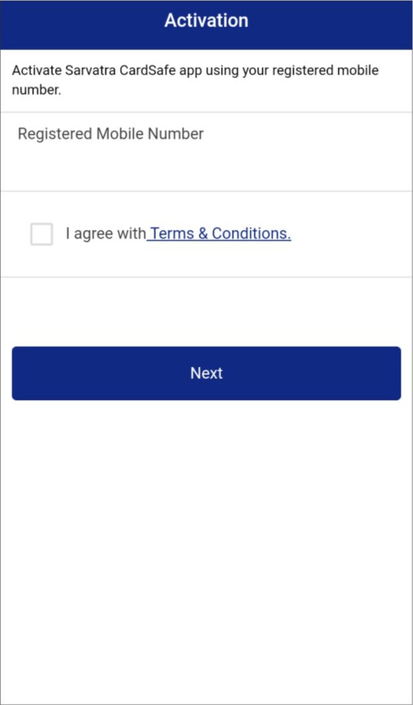 When customer opens CardSafe app 1st time, following window appears. Kindly enter mobile number registered with bank. Tick on I agree with terms and conditions and click on Next. It is necessary that card holder should have correct mobile number to be link with card.