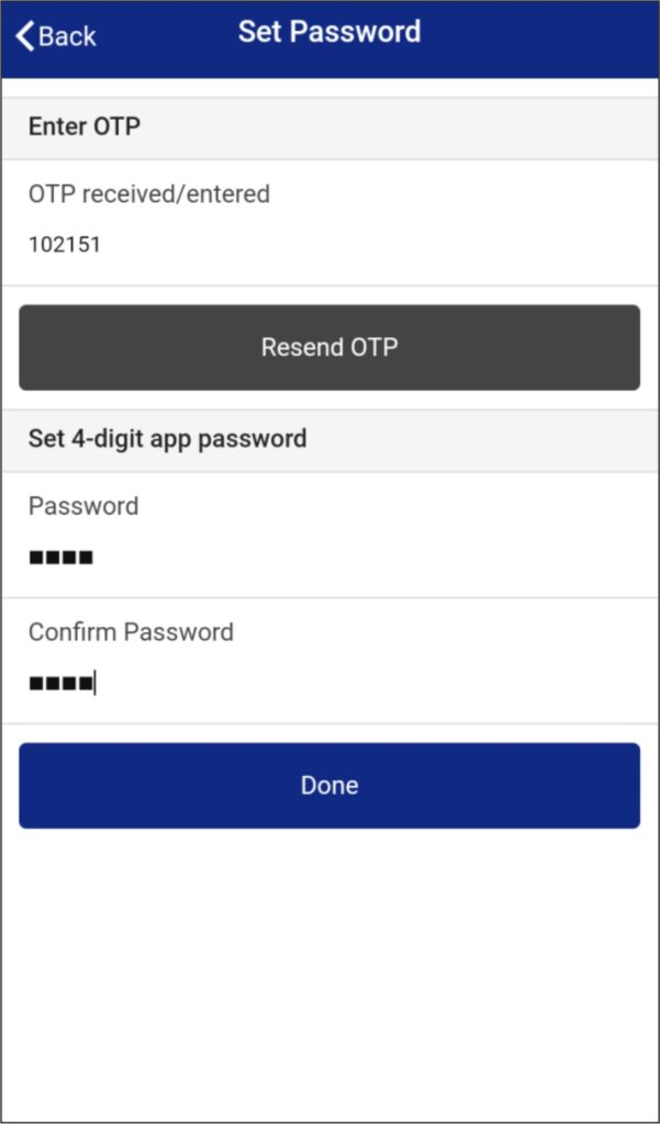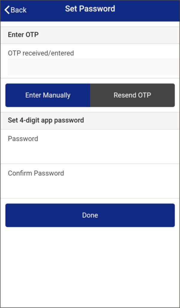User will receive OTP on his/her register mobile number for account registration in CardSafe. Click on Enter Manually. User needs to enter OTP and then needs to set 4 digit password with the reconfirmation once confirm he has to click on Done.