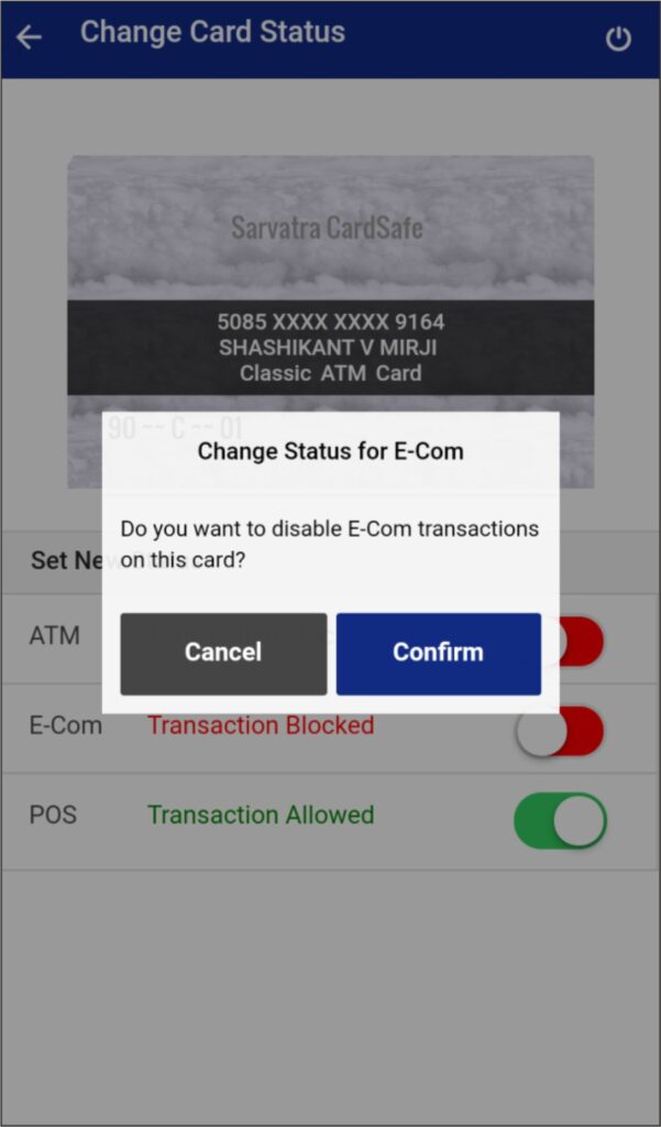 After changing status of any type of transaction (ATM, POS, E-COM), CardSafe application ask user for Cancel or Confirm.