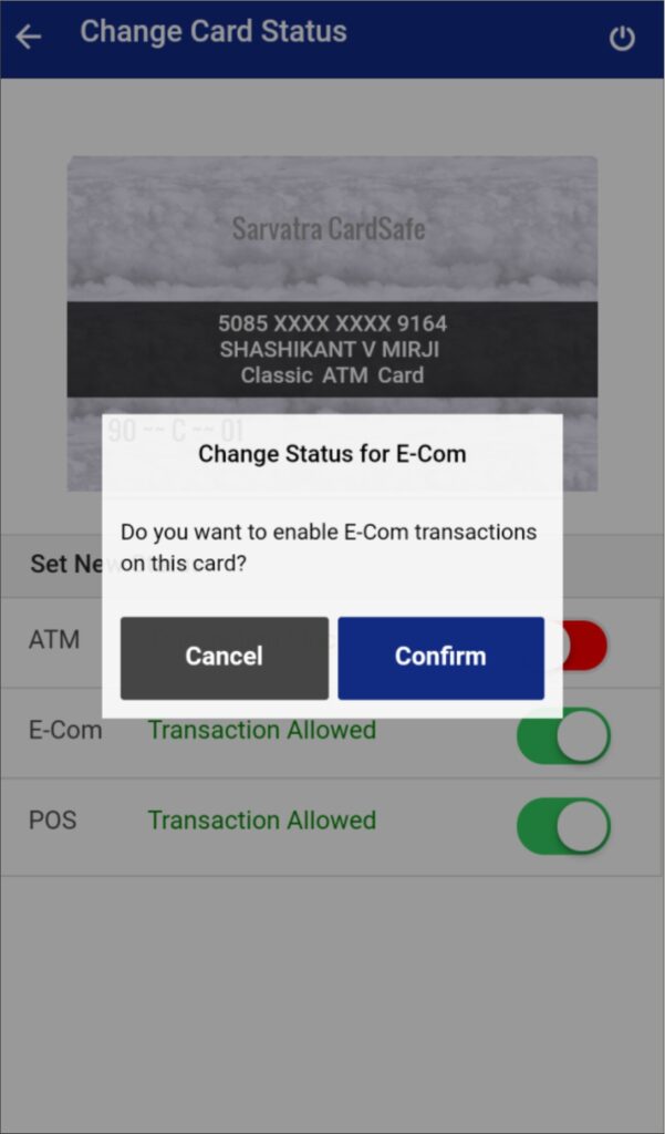 If user want to enable ECOM transaction, then he needs to set ECOM transaction status as enable again. CardSafe will ask user for enable confirmation. After confirmation, ECOM transaction will be enabled for selected card and SMS will be generated on registered mobile number.